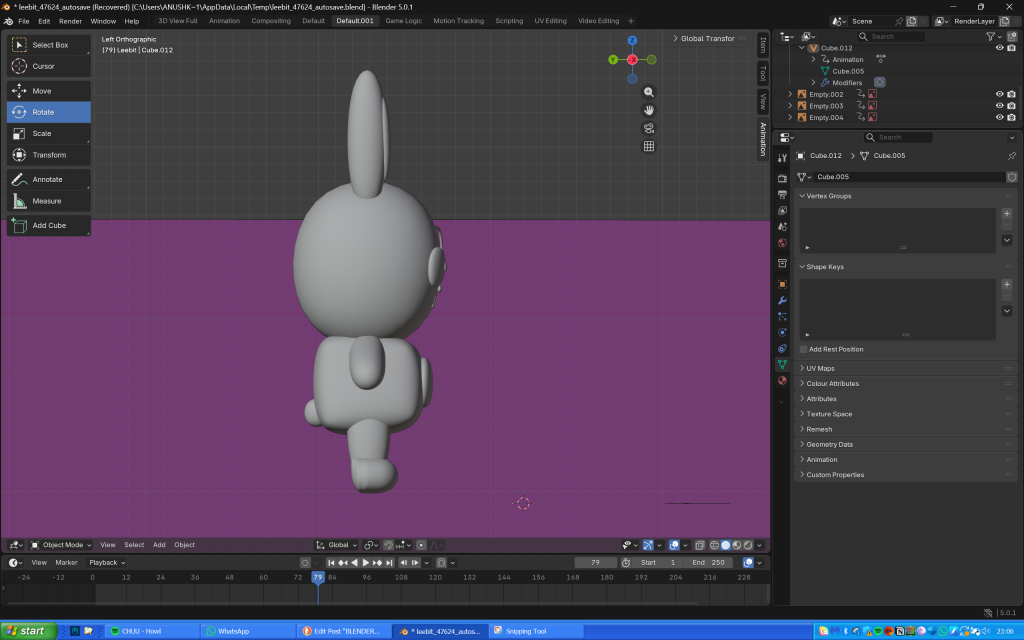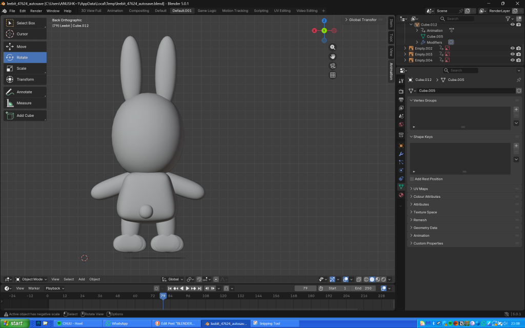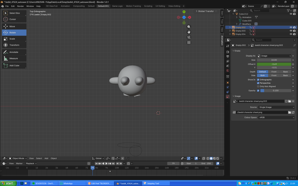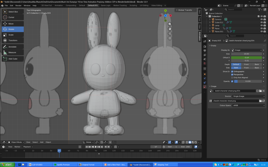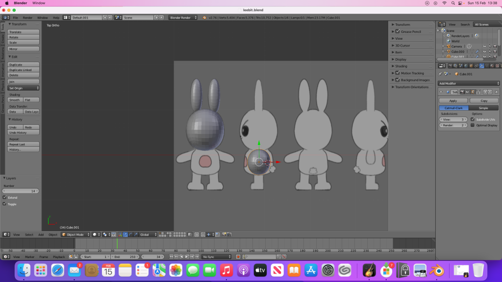 The next day, I used planes to make Leebit’s features (scaling them, making them 3D then shaping them into position), and paths for the antenna looking thing on his eyes (probably an eyelash or eye crease) and his mouth. I didn’t realise that I could make the entire body using just one cube as I ended up using several of them, thinking they would then seamlessly blend together when I used the shade smooth tool.