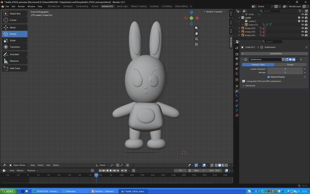 My progress after finishing shaping Leebit’s features, joining the components and adding the shade smooth tool