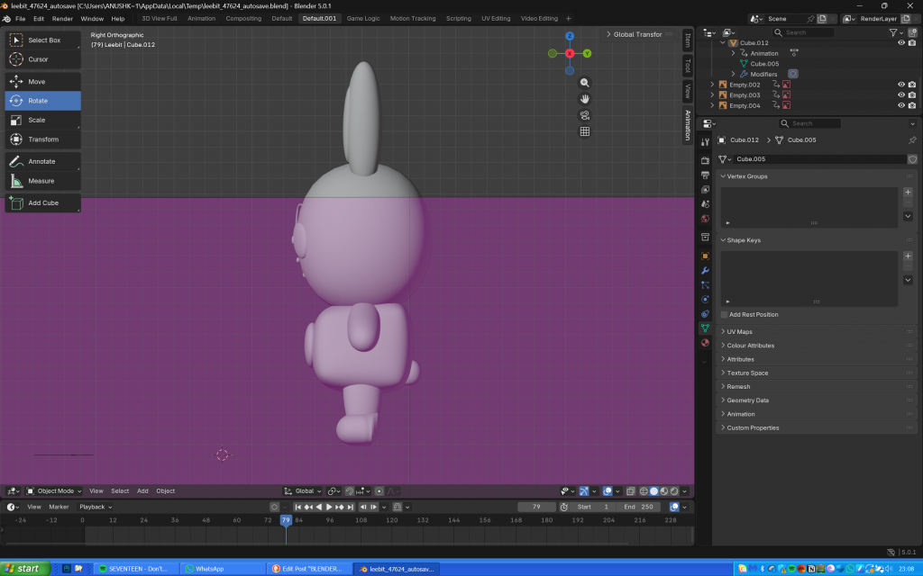 Overall he does look slightly misshapen, but I’m so proud of my creation nonetheless as I honestly thought making anything on Blender would be impossible and I wouldn’t be able to do it.